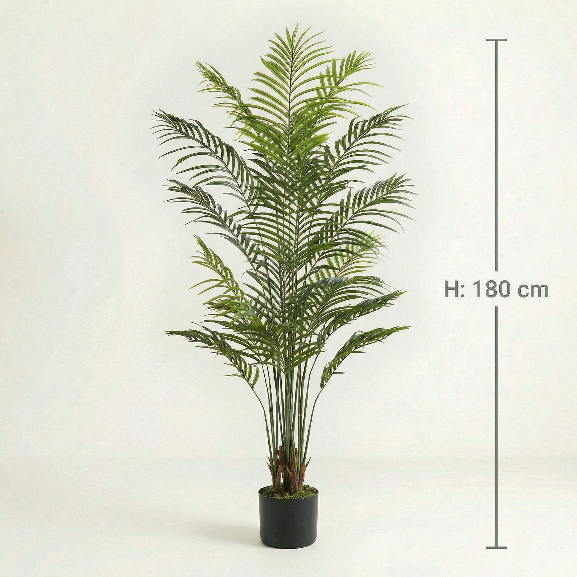 Denne kunstige Areca-palme med fint fjerformede, naturligt udseende blade giver boligarealer, kontorer eller læsehjørner et let, eksotisk udtryk og forbliver samtidig permanent vedligeholdelsesfri. Målene er: Plantens højde 180 cm, pottemål Højde ca. 12,7 cm og Ø ca. 15,2 cm.